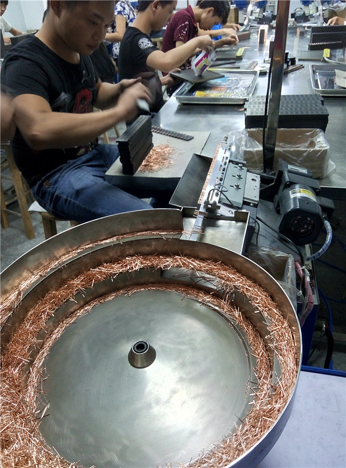 通过自动引脚分拣排列机器,一条条崭新的无氧铜引脚在模板上列队站齐,等待 着技术工人的安装。在这道工序中,吸引到芯粉们视线的,不仅仅是散发着魅惑 的红铜色的修长的无氧铜引脚,还有技术工人灵活熟练的操作技巧。这是一个胆 大心细的活计,只要引脚一点点的接触,技术工人熟练地卡住模具轻轻一震就可 以安装好等待焊接……引脚、芯片的组合,支撑起了整流桥的核心架构,每一个 细节都马虎不得。